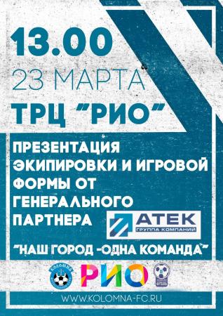 Впервые Футбольный Клуб «КОЛОМНА» представит новичков клуба, а так же новую экипировку от генерального партнера группы компаний «АТЕК». Мероприятие состоится 23 марта в ТРЦ «РИО».