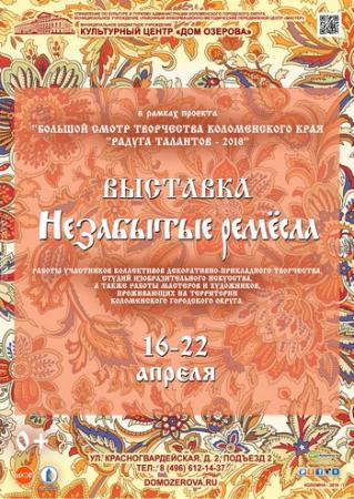 С 16 апреля в Культурном центре «Дом Озерова» в рамках проекта «Большой смотр творчества Коломенского края «Радуга талантов–2018» работает выставка декоративно-прикладного творчества и изобразительного искусства «Незабытые ремёсла».