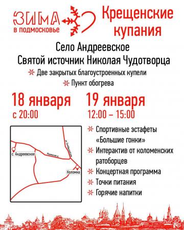 Центральной площадкой крещенских купаний станет Святой источник Николая Чудотворца в селе Андреевское. Он находится недалеко от храма Успения Божией Матери. Этот родник был обустроен усилиями верующих, и в декабре 2005 года, в день памяти святителя Николая, торжественно освящён. Купание здесь не прекращается круглый год, регулярно служится молебен, приезжают не только коломенцы, но и верующие со всей Московской области.