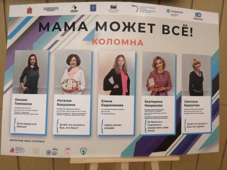 Его главная идея — показать, что можно добиться финансовой независимости, воспитывая детей и находясь в декретном отпуске. Для фотовыставки было собрано 200 фотоисторий женщин-предпринимателей. Каждая из них — состоявшийся профессионал своего дела, управленец или бизнесвумен, вдохновением которой стало материнство. Коломенский городской округ представили на фотовыставке «Мама может всё!» десять женщин-предпринимателей. Четыре представительницы приняли участие в презентации проекта в Доме Правительства Московской области.
