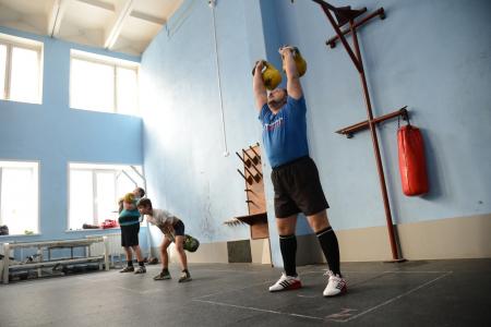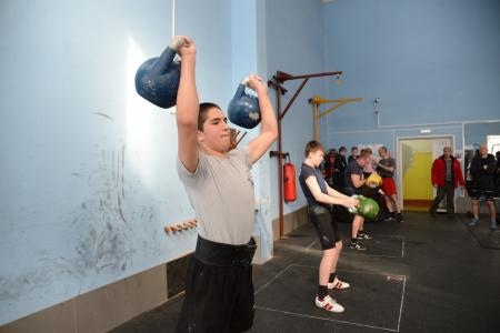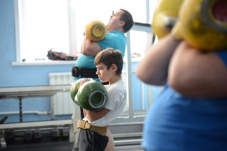Все спортсмены были распределены по возрастным категориям. Самые меленькие участники поднимали две гири весом по 8 кг, силачи постарше - по 12 кг, а юноши и мужчины - по 16 кг.