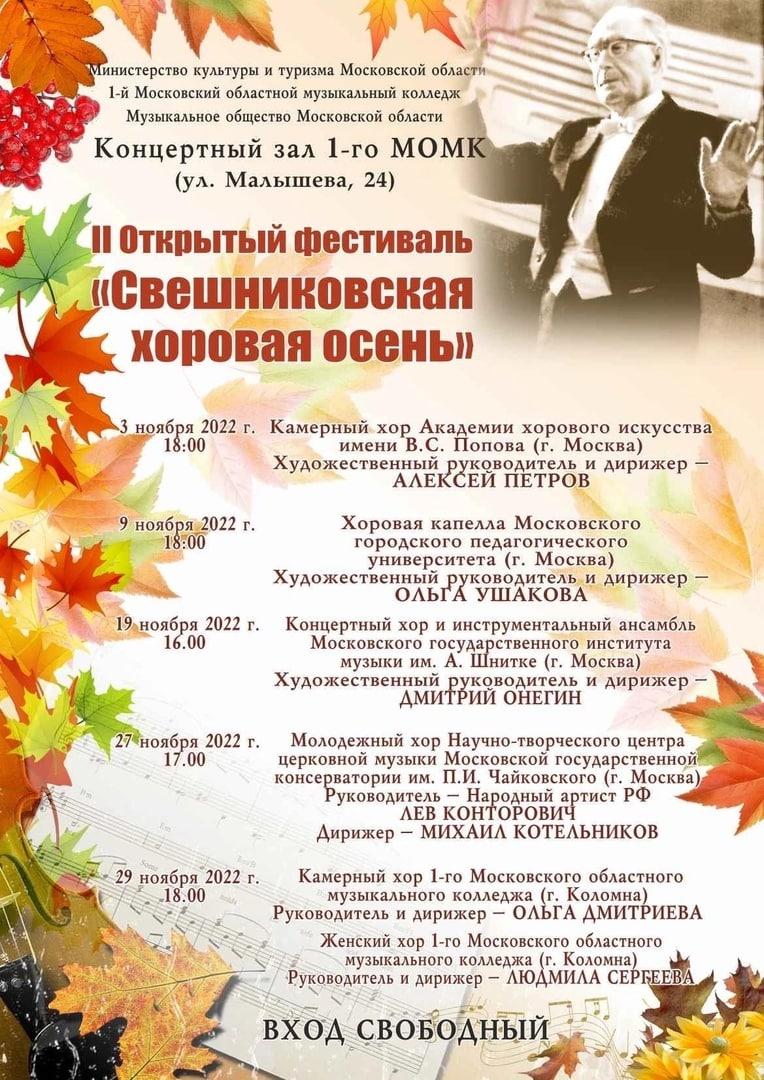 Фестиваль хоровой музыки «Свешниковская хоровая осень»16 ноябрь 2018Московский областной открытый хоровой конкурс «А.В. Свешников и современность»30 ноябрь 2019Программа фестиваля музыкальных редкостей и гастрономических изысков «Шкинь-Опера»02 июнь 2018В Коломне провели конференцию «А.В. Свешников и современность»02 декабрь 2020В Краеведческом музее открыли выставку «Песнь его – жизнь его»09 сентябрь 2020