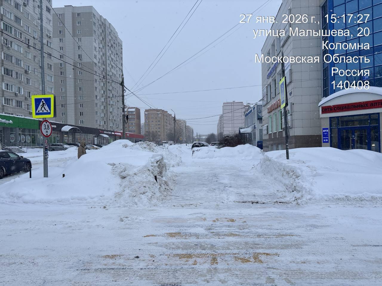 Жители Коломны обратили внимание властей на пешеходный переход, расположенный на улице Малышева. Обильный снегопад засыпал подходы к нему, которые со временем были утоптаны и покрылись наледью, а дорожная техника во время расчистки сформировала высокие сугробы, из-за которых снизилась видимость.