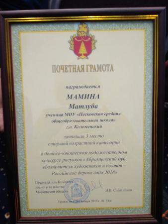 Матлуба Мамина ученица Песковской школы Коломенского городского округа стала обладательницей 3 места в старшей возрастной категории по итогам регионального этапа Конкурса.