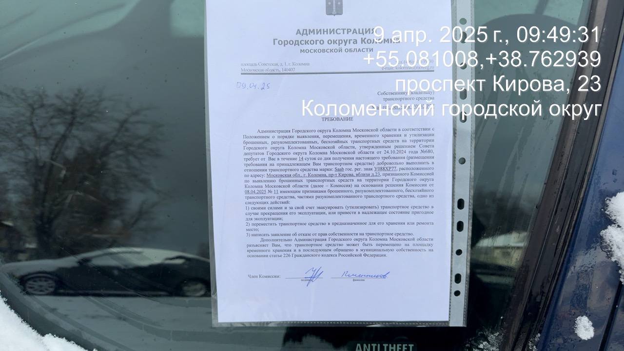 Разыскивается собственник (владелец) транспортного средства марка/модель Saab гос. рег. знак У088ХР77, припаркованного по адресу: Московская обл., г. Коломна, пр-т Кирова, вблизи д. 23.