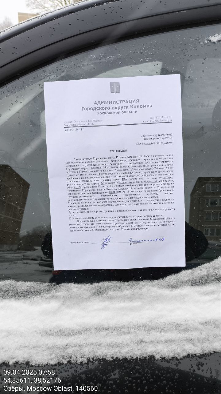 Разыскивается собственник (владелец) транспортного средства марка/модель KIA Sorento без гос. рег. знака, припаркованного по адресу: Московская обл., г.о. Коломна, г. Озеры, 1-й микрорайон, вблизи д. 24.