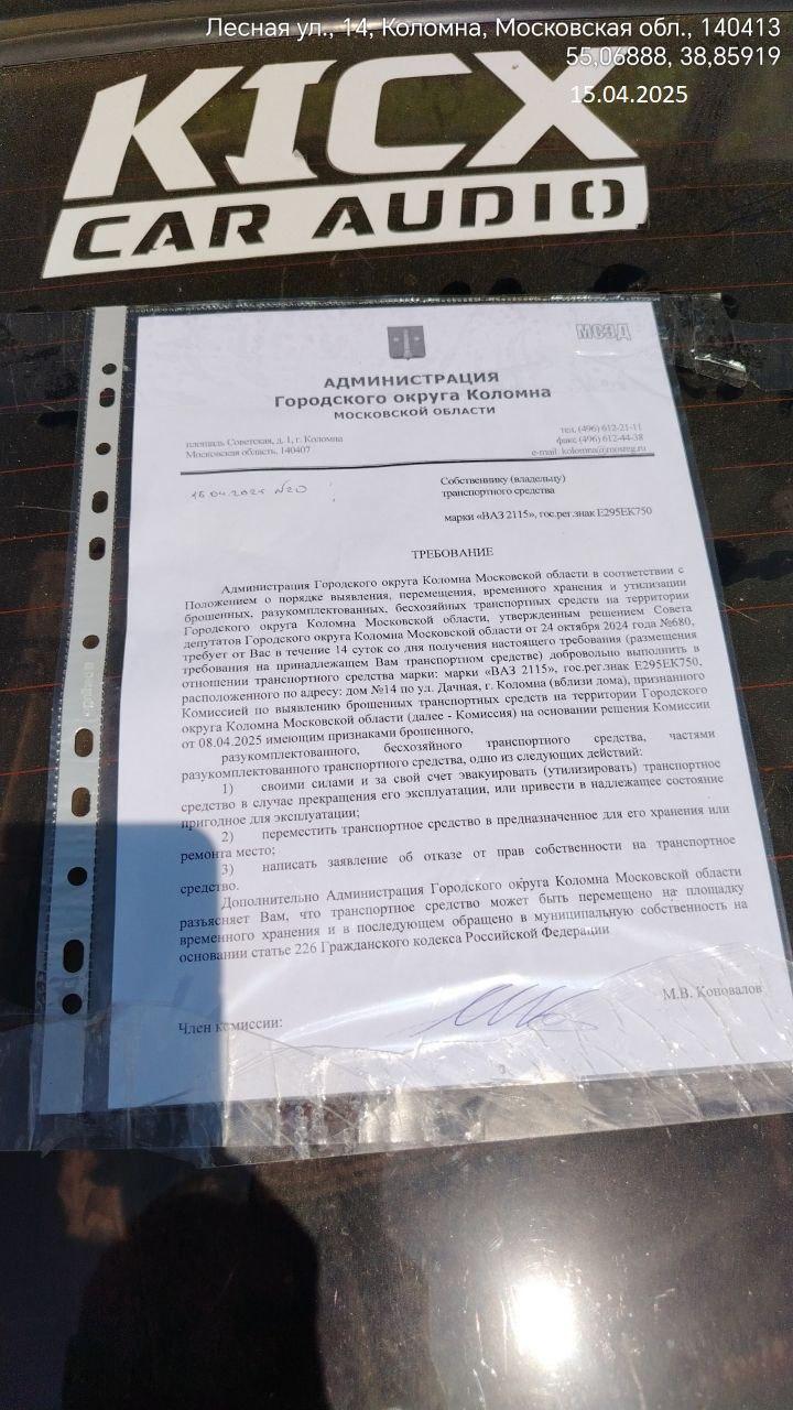 Разыскивается собственник (владелец) транспортного средства марки «ВАЗ 2115», гос.рег.знак Е295ЕК750, размещенного вблизи дома №14 по ул. Дачная, г. Коломна.