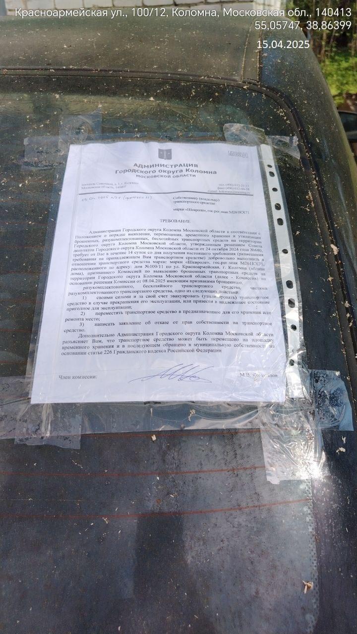 Разыскивается собственник (владелец) транспортного средства марки «Шевроле», гос.рег.знак М261КХ71, размещенного вблизи дома №100/11 по ул. Красноармейская, г. Коломна.