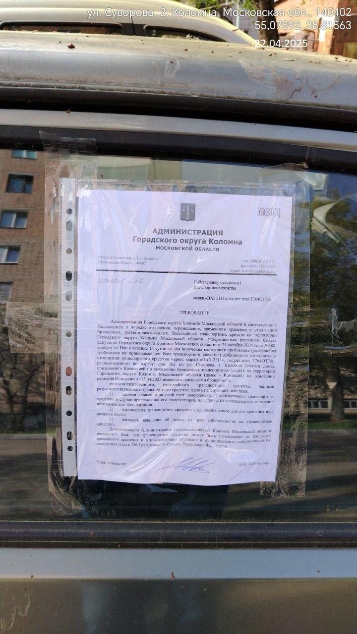 Разыскивается собственник (владелец) транспортного средства марки «ВАЗ 2113», гос.рег.знак Т764ОТ750, размещенного вблизи дома №2 по ул. Суворова, г. Коломна.