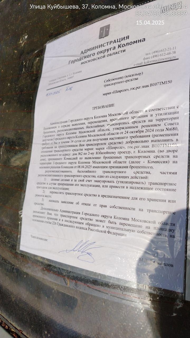Разыскивается собственник (владелец) транспортного средства марки «Шевроле», гос.рег.знак В107ТМ150, размещенного во дворе дома №2 по ул. 2-й Юбилейный проезд, г. Коломна.