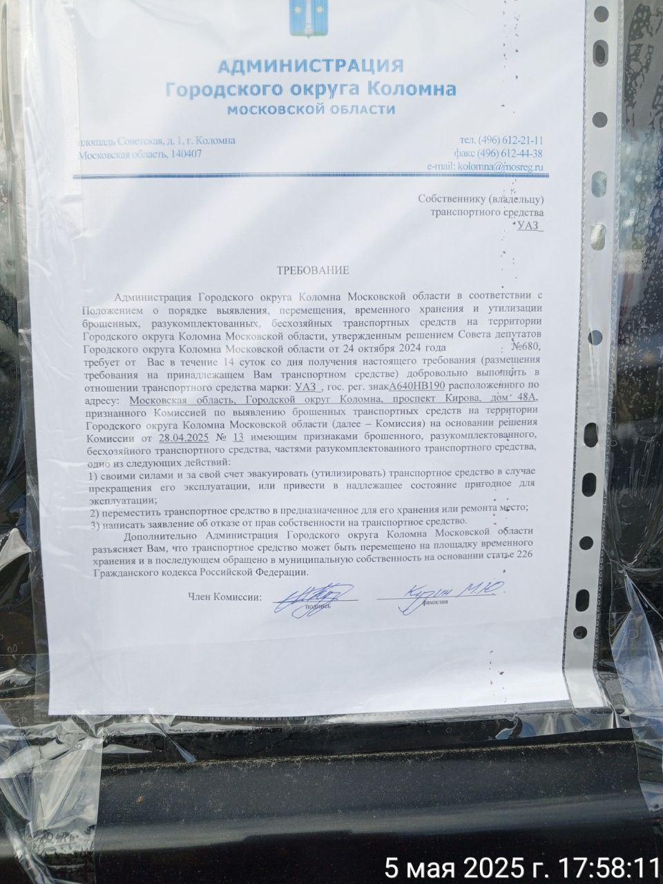 Разыскивается собственник (владелец) транспортного средства марки УАЗ, гос.рег.знак А640НВ190, расположенного по адресу: Московская обл., г. Коломна, проспект Кирова, д.48 А.