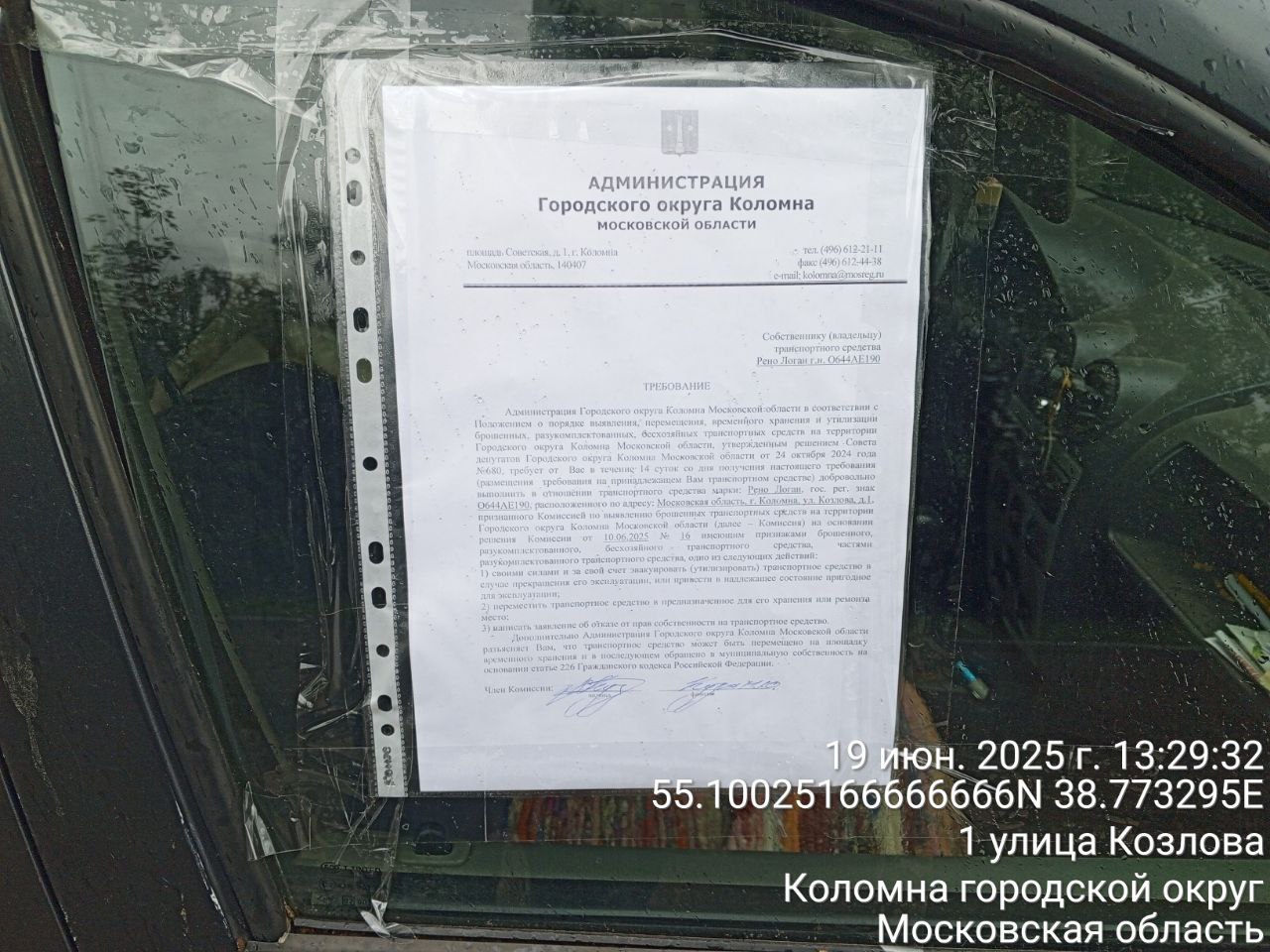Разыскивается собственник (владелец) транспортного средства марка/модель Рено "Логан" гос. рег. знак О644АЕ190, припаркованного по адресу: Московская область, г. Коломна, ул. Козлова, вблизи д.1