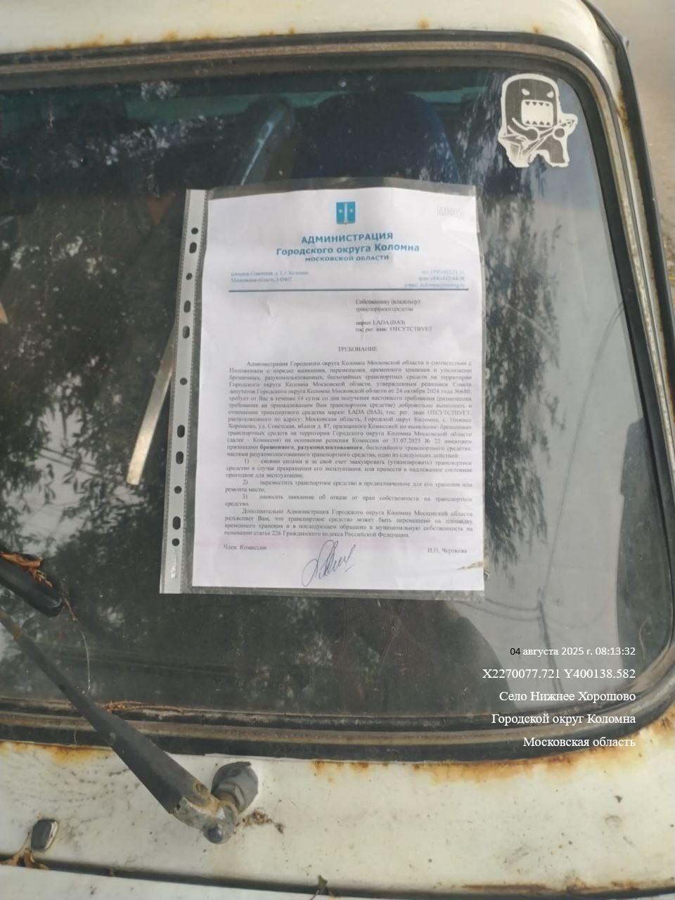 Разыскивается собственник (владелец) транспортного средства марки ВАЗ (ЛАДА), гос. рег. знак ОТСУТСТВУЕТ, расположенный по адресу: Московская область, Городской округ Коломна, с. Нижнее Хорошово, ул. Советская, вблизи д. 87.