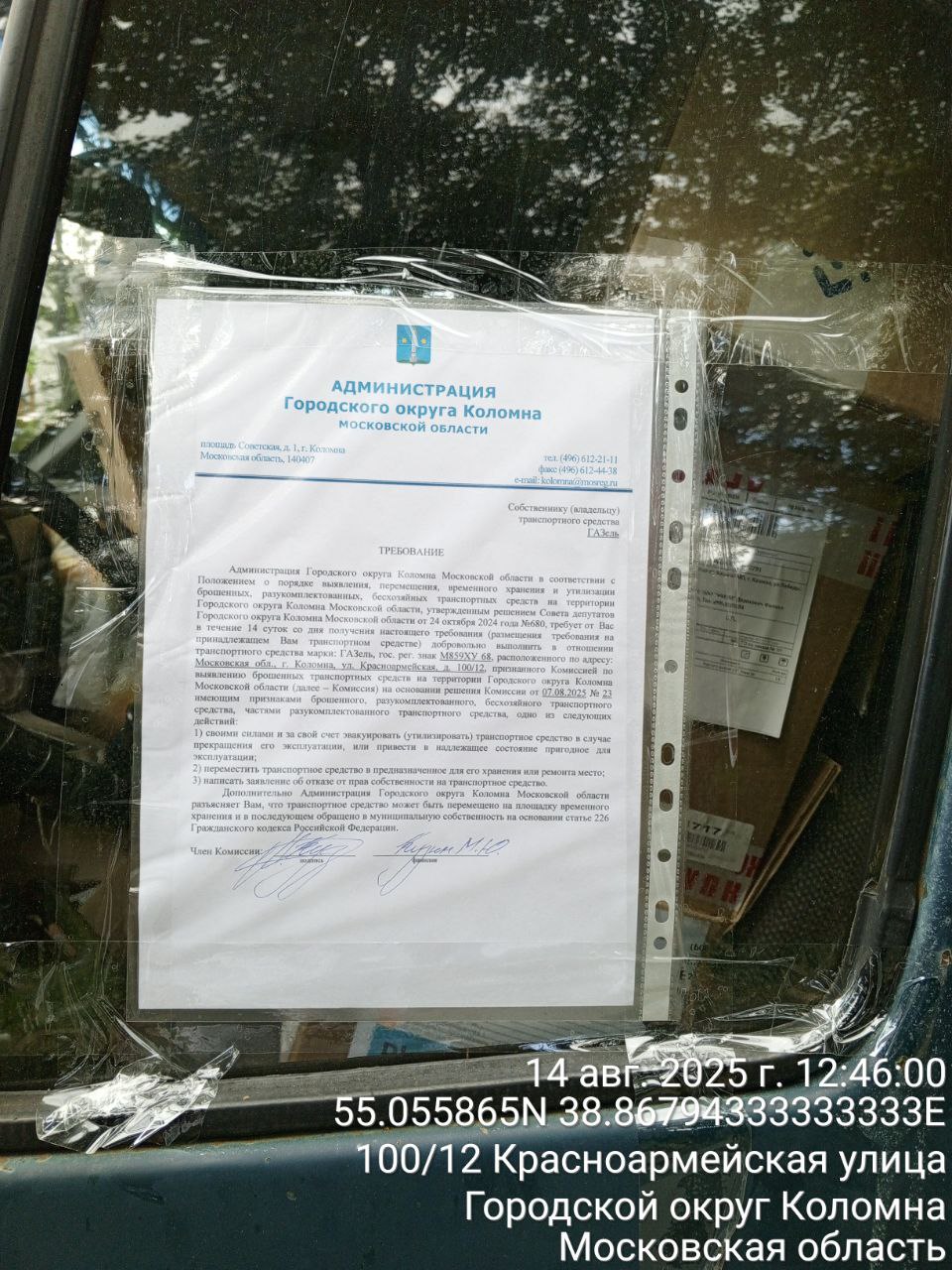 Разыскивается собственник (владелец) транспортного средства марка/модель ГАЗель гос. рег. знак М859ХУ68, припаркованного поадресу: Московская область, г.о. Коломна, ул. Красноармейская, вблизи д. 100/12.