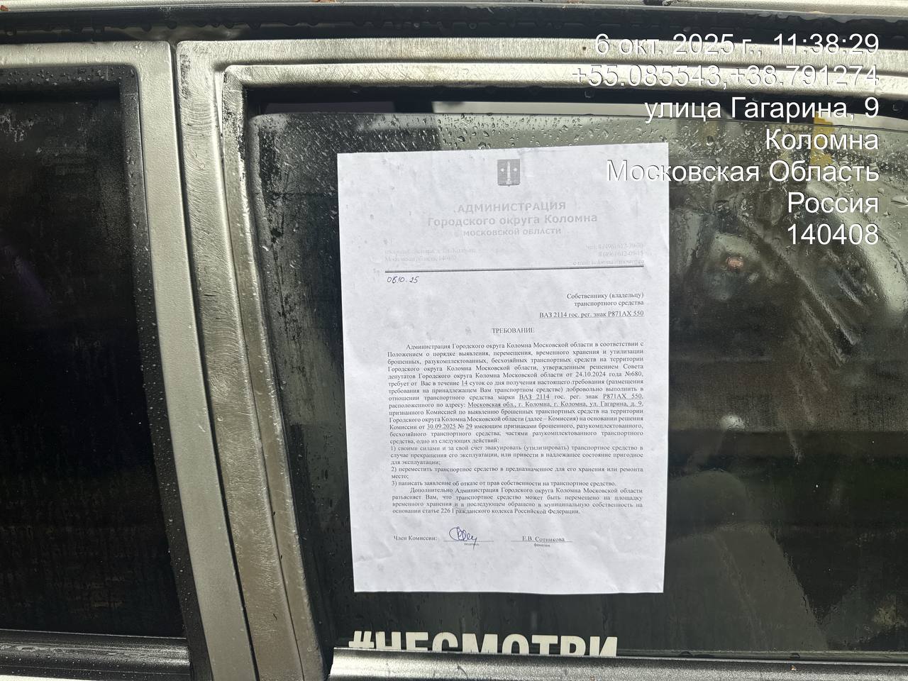 Разыскивается собственник (владелец) транспортного средства марка/модель ВАЗ 2114 гос. рег. знак Р871АХ 550, размещенного по адресу: Московская обл., г. Коломна, ул. Гагарина, д. 9.