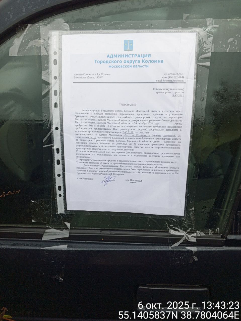 Разыскивается собственник (владелец) транспортного средства марки ВАЗ 2111 без гос. рег. знака, размещенное по адресу: Московская обл., г.о. Коломна, с. Нижнее Хорошово, ул. Центральная, д. 11