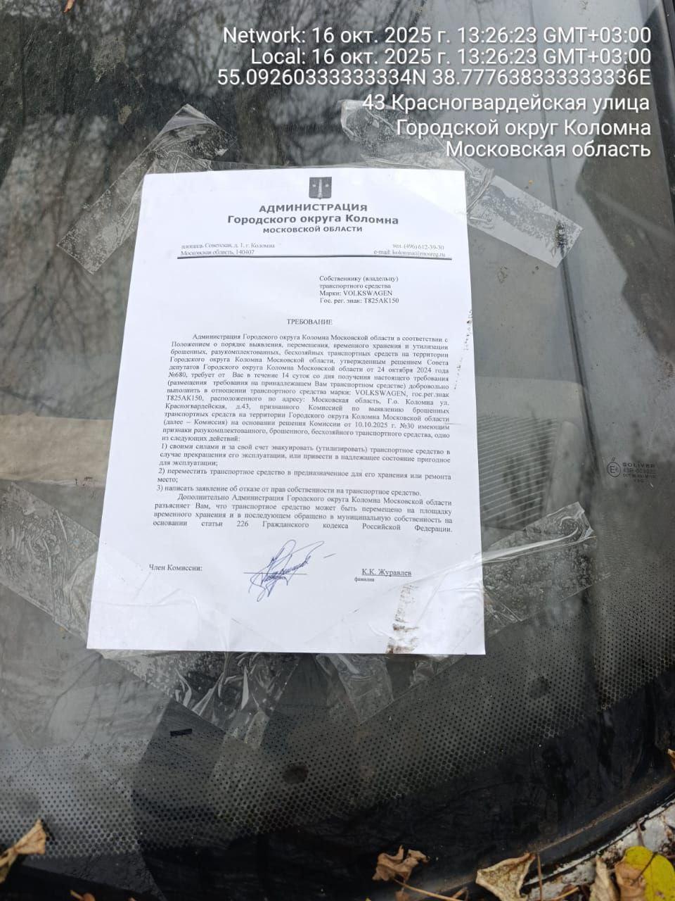 Разыскивается собственник (владелец) транспортного средства марки: VOLKSWAGEN, гос. рег. знак Т825АК 150, расположенный по адресу: Московская обл., г. Коломна, ул. Красногвардейская, д. 43.