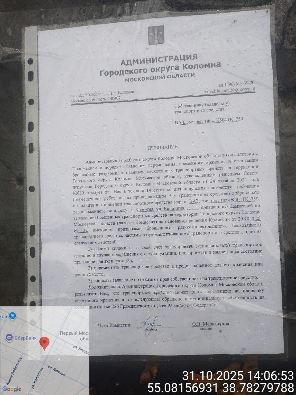 Разыскивается собственник (владелец) транспортного средства марки ВАЗ, государственный регистрационный знак К504ТК 750, по адресу: г. Коломна, ул. Калинина, 15.