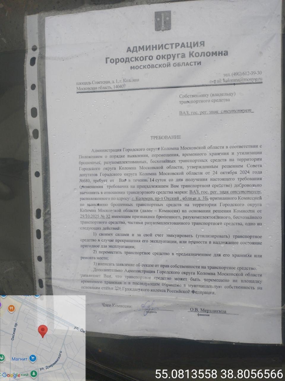 Разыскивается собственник (владелец) транспортного средства марки ВАЗ, по адресу: г. Коломна, пр-т Окский, вблизи д. 3б