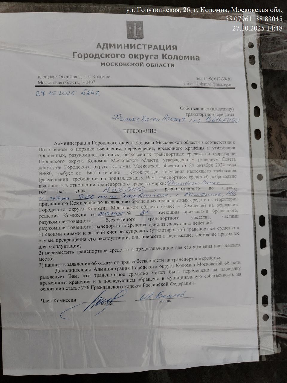 Разыскивается собственник (владелец) транспортного средства марки Фольксваген Пассат гос. рег. знак В616ЕН90, размещенного по адресу: Московская обл., Г.о. Коломна, ул. Голутвинская, 26.
