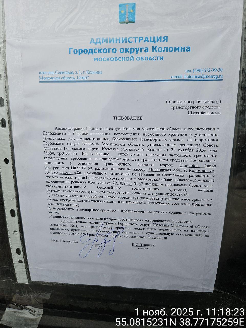 Разыскивается собственник (владелец) транспортного средства марки Chevrolet Lanos гос. рег. знак Н872ВУ50, размещенного по адресу: Московская обл., г.о. Коломна, ул. Дзержинского, д.86.