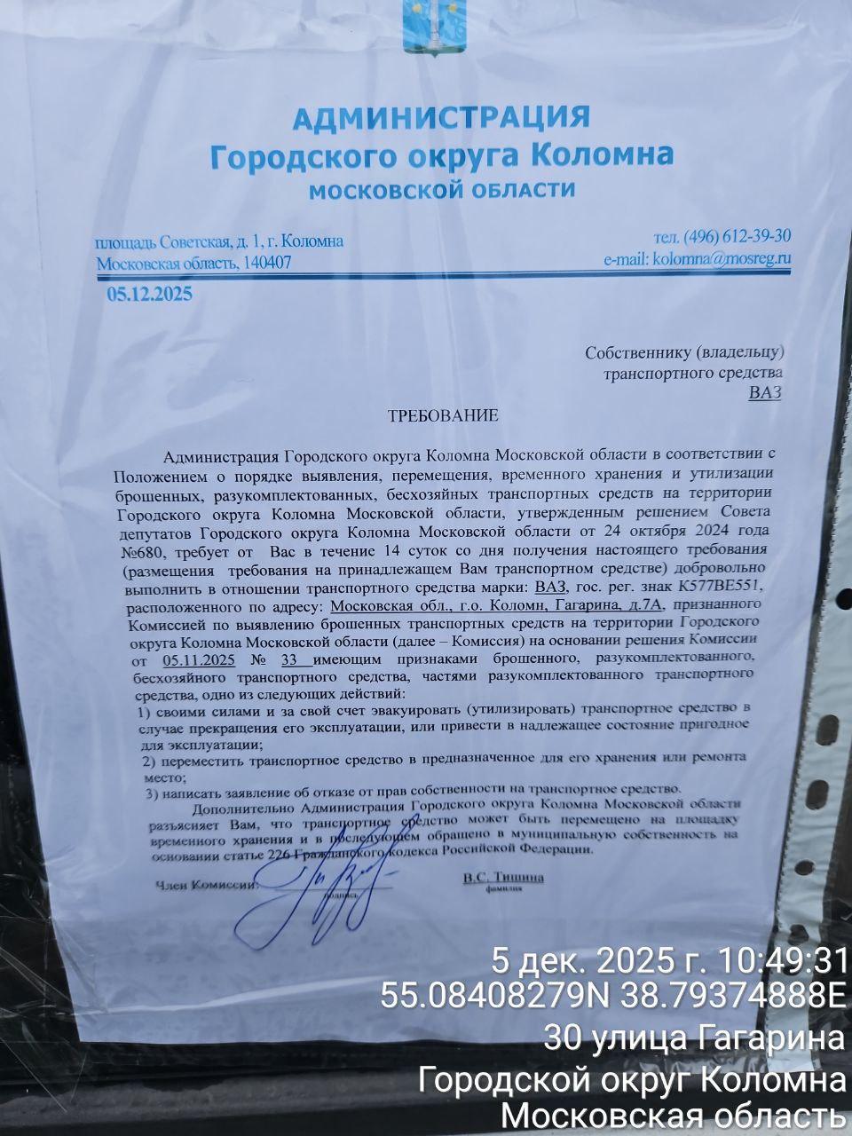 Разыскивается собственник (владелец) транспортного средства марки -ВАЗ гос. рег. знак К577ВЕ551 размещенное по адресу:Московская обл., г.о. Коломна, ул. Гагарина, д.7А
