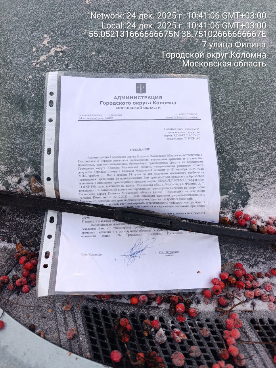 Разыскивается собственник (владелец) транспортного средства марки: RENAULT SCENIC гос. рег. знак Т138ХР190, расположенный по адресу: Московская область, г. Коломна, ул. Филина, д. 7