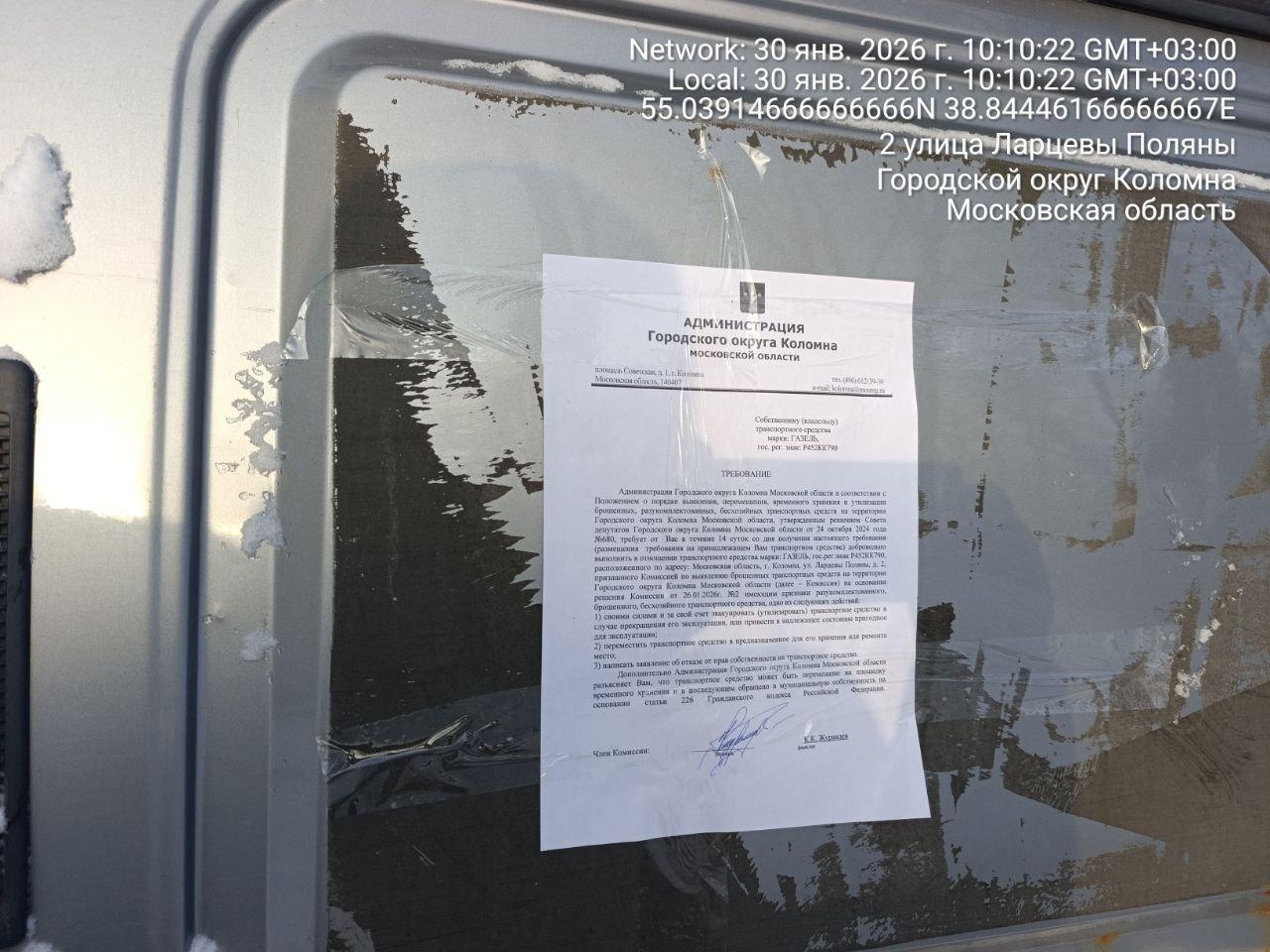 Разыскивается собственник (владелец) транспортного средства марки ГАЗель гос. рег. знак Р452КК790, размещенного по адресу: Московская обл., г. Коломна, ул. Ларцевы Поляны, д. 2.