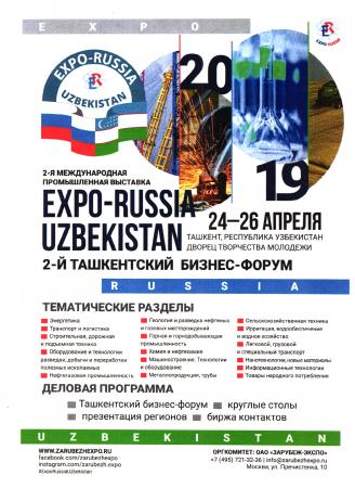 Информируем о том, что с 24 по 26 апреля 2019 года состоится Вторая международная промышленная выставка «EXPO-RUSSIA UZBEKISTAN 2019» и Межрегиональный Бизнес-форум. В выставке планируют принять участие компании, представляющие крупный, малый и средний бизнес из России, Узбекистана, а также стран Центральной Азии. В экспозициях будут представлены новейшие разработки в направлениях: энергетика, машиностроение, автомобильный и железнодорожный транспорт, строительство, сельское хозяйство, нефтегазовая и химическая промышленность, медицина и фармацевтика, банковская деятельность, телекоммуникации, информационные технологии, образование. Состоится международная конференция «Сотрудничество России и Узбекистана в «цифровой экономике», круглые столы по основным отраслям российско-узбекского сотрудничества с участием деловых кругов стран Центральной Азии. Продолжение переговоров продолжится также в ходе посещений предприятий Узбекистана.