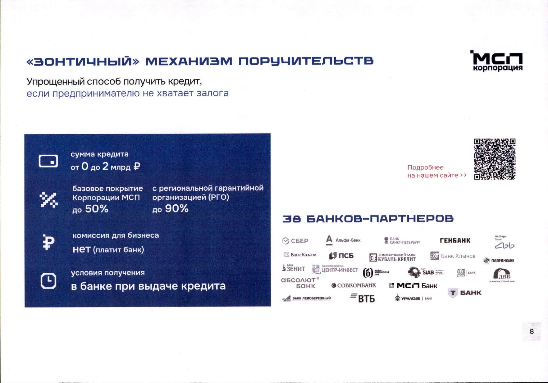 - Гарантийная поддержка в виде «зонтичного» механизма предоставления поручительств. «Зонтичный» механизм предполагает предоставление банкам-парнерам Корпорации МСП лимитов поручительства, в рамках которых банки выдают кредиты субъектам МСП, обеспеченные поручительством Корпорации МСП. За счет «зонтичного» механизма субъекты МСП имеют возможность снизить объемы требуемых при кредитовании залогов и повысить вероятность одобрения кредита. Направление документов в Корпорацию МСП для получения поручительства не требуется, поручительство Корпорации встроено в кредитный процесс банков и бесплатно для субъекта МСП. Объем обеспечения Корпорацией МСП по кредитам может составлять до 50% от суммы основного долга по кредиту. Подробная информация о «зонтичном» поручительстве размещена на официальном сайте Корпорации в разделе: «Малому и среднему бизнесу» - «Гарантийная поддержка» – «Зонтичные» поручительства» и доступна по ссылке: https://clck.ru/3RfFuF.