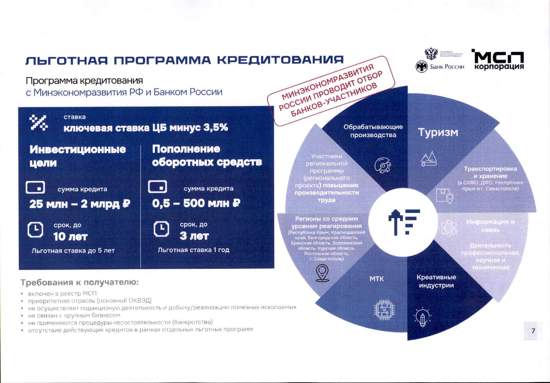 Уровень процентной ставки по кредиту рассчитывается как ключевая ставка Центрального банка Российской Федерации, уменьшенная на 3,5% годовых. В настоящее время Министерством экономического развития Российской Федерации проводится отбор банков-участников программы кредитования. Подробная информация о льготной программе кредитования размещена на официальном сайте Корпорации в разделе: «Малому и среднему бизнесу» - «Льготные программы кредитования и займы» - «Льготная программа кредитования» и доступна по ссылке: https://clck.ru/3RfFsC.