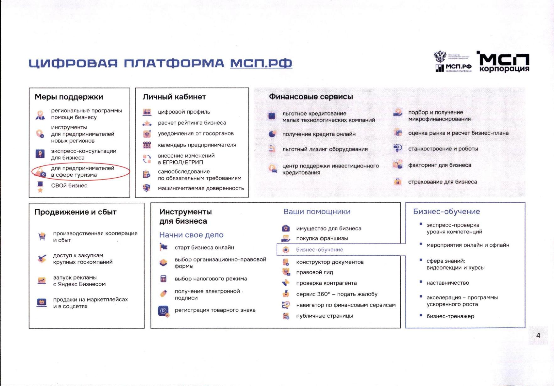 Федеральной корпорацией по развитию малого и среднего предпринимательства на Цифровой платформе МСП.РФ запущен сервис «Поддержка предпринимателей в сфере туризма» (https://мсп.рф/services/tourism/promo/), который позволяет: