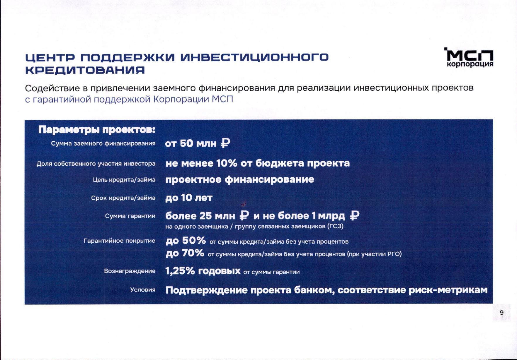 - Независимые гарантии Корпорации МСП по обязательствам субъектов МСП, используемые в качестве обеспечения при привлечении заемного финансирования на сумму свыше 50 млн рублей, в том числе при реализации инвестиционных проектов по льготным программам. Объем обеспечения Корпорацией МСП может составлять до 50% от суммы основного долга по кредиту, но не более 1 млрд рублей. Независимые гарантии могут быть предоставлены инвестиционным проектам, направленным финансовыми организациями-партнерами (в том числе банками), а также проектам, получившим поддержку в сервисе «Центр поддержки инвестиционного кредитования» на Цифровой платформе МСП.РФ (https://мсп.рф/services/competence-credit/promo/). Подробная информация о гарантийной поддержке Корпорации МСП размещена на официальном сайте Корпорации МСП в разделе: «Банкам и финансовым организациям» - «Гарантийный механизм» и доступна по ссылке: https://clck.ru/3RmZmw.