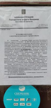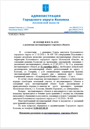 Извещение №42/23 о демонтаже нестационарного торгового объекта по адресу: г.Коломна, улица Гагарина, у дома №16, специализация: кондитерские изделия (вывеска - "Кондитерская Юнайк").)