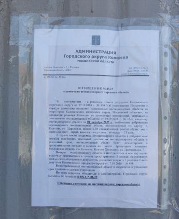 Извещение №43/23 о демонтаже нестационарного торгового объекта по адресу: г. Коломна, улица Щуровская, вблизи д.3В, специализация: ремонт обуви (вывеска – отсутствует).