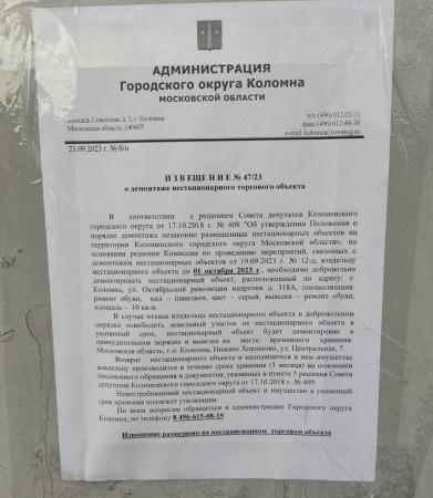 Извещение №47/23 о демонтаже нестационарного торгового объекта по адресу: г. Коломна, улица Октябрьской революции напротив д. 318А, специализация: ремонт обуви (вывеска – ремонт обуви).