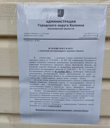 Извещение №50/23 о демонтаже нестационарного торгового объекта по адресу: г. Коломна, улица Добролюбова, вблизи д. 4а, специализация: ремонт обуви (вывеска – ремонт обуви).