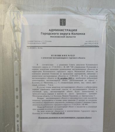 Извещение №52/23 о демонтаже нестационарного торгового объекта по адресу: г. Коломна, улица Малышева, у д. 15, специализация: печать.