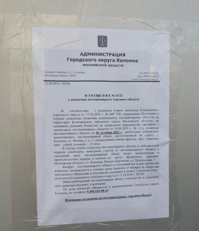 Извещение №53/23 о демонтаже нестационарного торгового объекта по адресу: г. Коломна, улица Филина, у д. 2, специализация: овощи, фрукты.