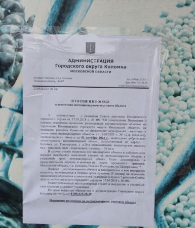 Извещение №56/23 о демонтаже нестационарного торгового объекта по адресу: г. Коломна, улица Пионерская, у д.50-а, специализация: кондитерские изделия.