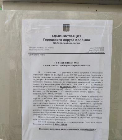 Извещение №57/23 о демонтаже нестационарного торгового объекта по адресу: г. Коломна, улица Пионерская, у д.21, специализация: овощи, фрукты.