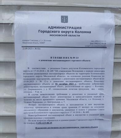 Извещение №59/23 о демонтаже нестационарного торгового объекта по адресу: г. Коломна, улица Дзержинского, у д. 85, специализация: печатная продукция.