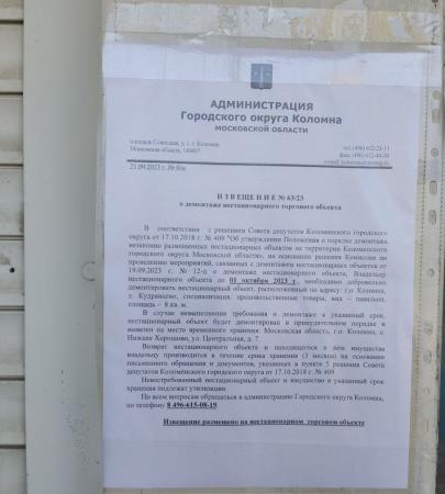 Извещение №63/23 о демонтаже нестационарного торгового объекта по адресу: г.о. Коломна, деревня Кудрявцево, специализация: продовольственные товары.