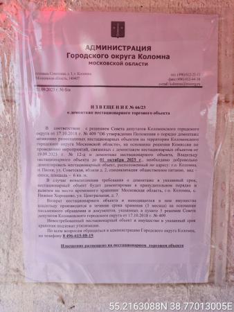 Извещение №66/23 о демонтаже нестационарного торгового объекта по адресу: г.о. Коломна, поселок Пески, улица Советская, вблизи д. 2, специализация: общественное питание.