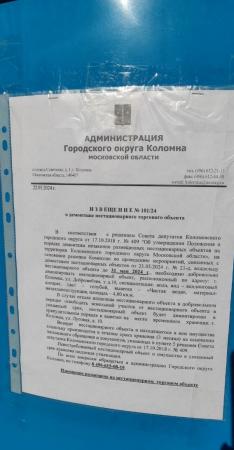 Извещение № 101/24 о демонтаже нестационарного торгового объекта по адресу: г. Коломна, ул. Добролюбова, у д.19, специализация: вода, вид – вендинговый аппарат, цвет–голубой, вывеска–«Чистая вода», материал-металлоконструкция, площадь-4 кв.м