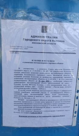 Извещение № 102/24 о демонтаже нестационарного торгового объекта по адресу: г. Коломна, Бульвар 800-летия Коломны, у д.15, специализация: вода, вид– вендинговый аппарат, цвет–голубой, вывеска–«Чистая вода», материал-металлоконструкция, площадь-4 кв.м