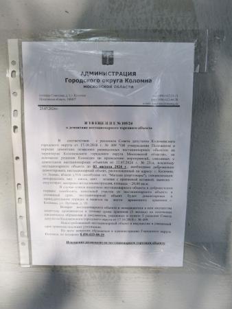 Извещение № 105/24 о демонтаже нестационарного торгового объекта по адресу: г.Коломна, ул. Ленина, вблизи д.53А (автобусная ост. "Магазин спорттовары"), специализация: неопределена, вид–киоск, цвет–зеленый с оранжевой вставкой, пл.20 кв.м.