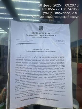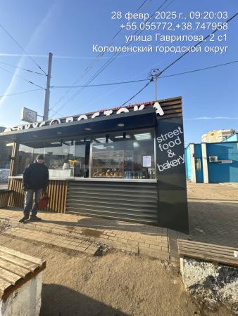 Извещение № 117/25 о демонтаже нестационарного торгового объекта по адресу: г. Коломна, ул. Гаврилова, вблизи д.2, Пункт быстрого питания, вид–киоск, цвет–серый с латунными вставками и коричневыми рейками, материал-металлоконструкция, площадь-24 кв.м
