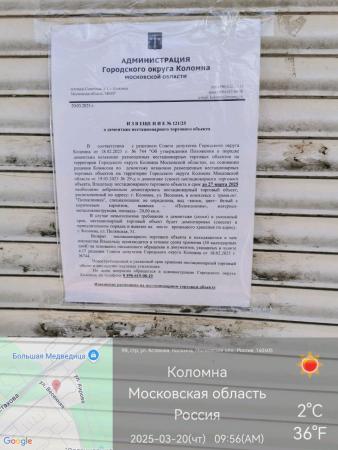 Извещение № 121/25 о демонтаже нестационарного торгового объекта по адресу: г. Коломна, ул. Весенняя, в комплексе с трамв.ост. , вид –киоск, цвет– белый с коричневым карнизом, вывеска – «Поликлиника", материал-металлоконструкция, площадь- 20,00 кв.м.