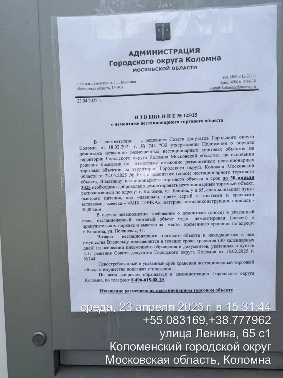 Извещение № 125/25 о демонтаже НТО по адресу: г. Коломна, ул. Ленина, у д.65, специализация: пункт быстрого питания, вид –павильон, цвет– серый с желтыми и красными вставками, вывеска – «MIX ТОЧКА», материал-металлоконструкция, площадь - 30,00 кв.м.